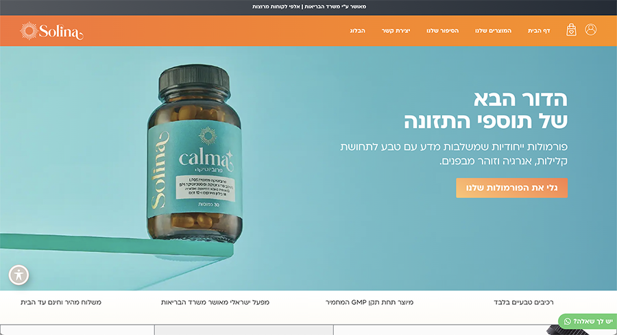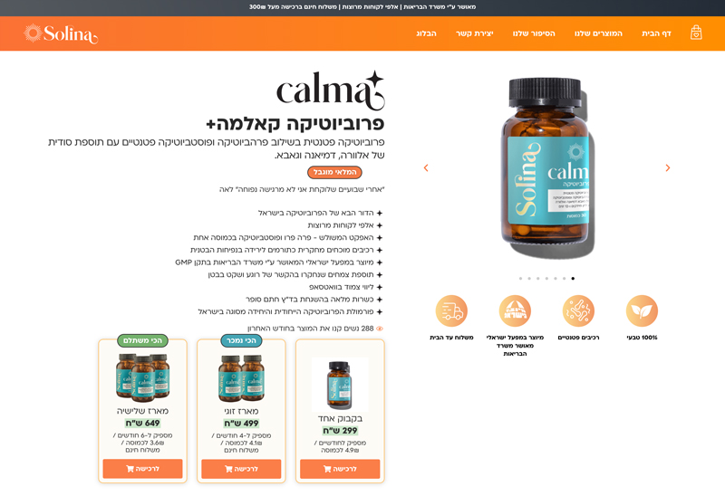 תכנון, ניימינג, עיצוב, פיתוח וקופירייטינר לעמוד מוצר מכירתי Calma+ האתגר סולינה היא חברת תוספי תזונה חדשה יחסית בשוק, שרצתה להכנס לעולם עם תחרות קשה. התחלנו