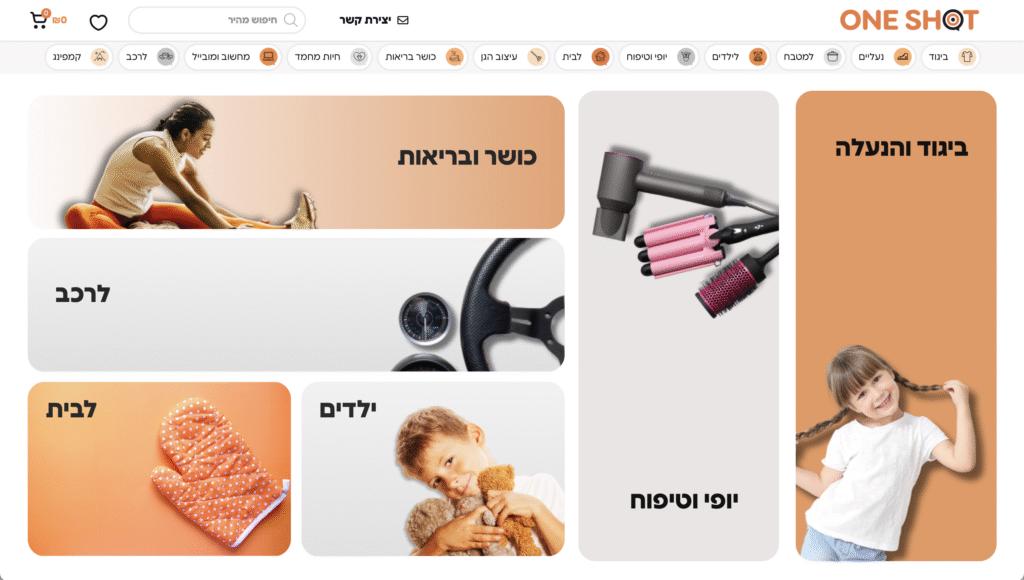 מיתוג, עיצוב ופיתוח חלקי של אתר חנות ONE BEST SHOT- אתר חנות onebestshot.com הוא אתר קניות מקוון שמוכר מגוון מוצרים לצריכה אישית ולבית, בדגש על